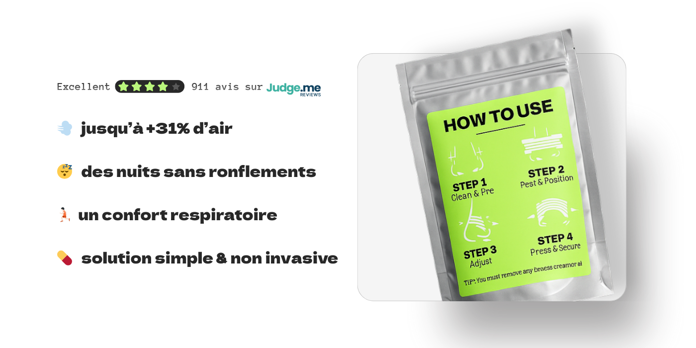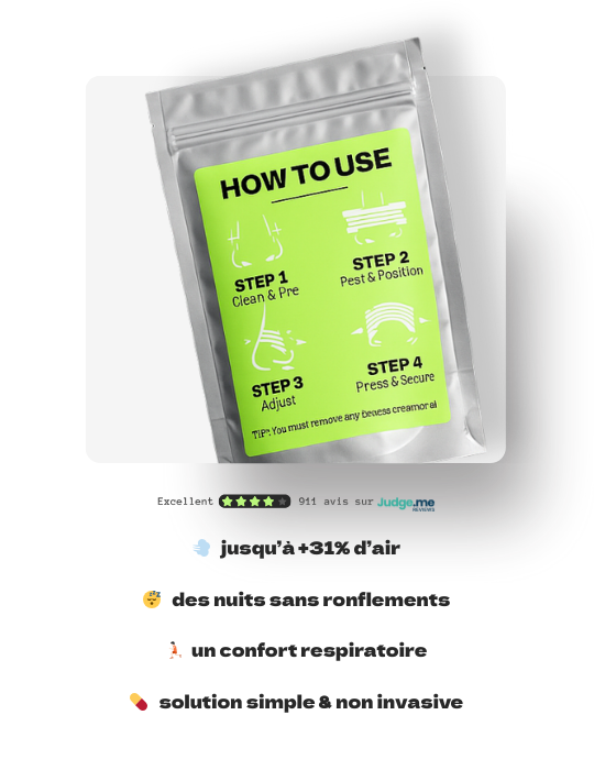 Las tiras nasales BreatheBetter despejan las vías respiratorias, promueven una respiración nasal fluida y reducen significativamente los ronquidos desde la primera noche. El resultado: un sueño más profundo, una mejor recuperación y, por fin, noches tranquilas.
